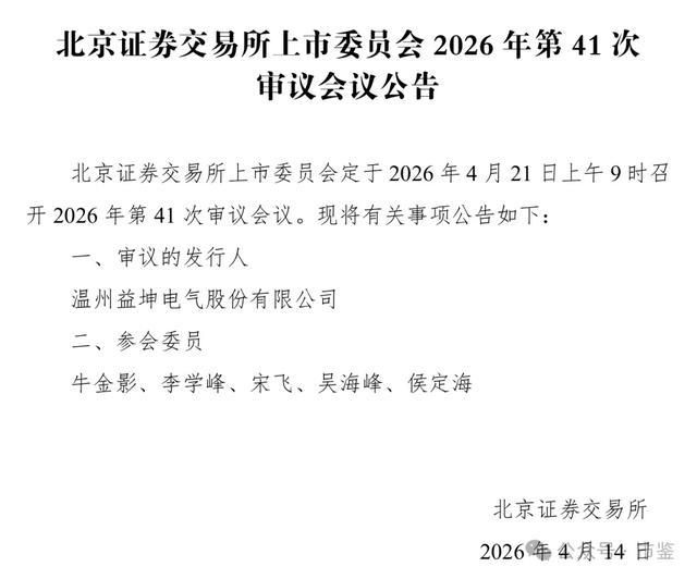 根据安排,北交所上市委员会定于4月21日召开2026年第41次审议会议配资平台排名前十的,审核温州益坤电气股份有限公司(以下简称“益坤电气”)首发事项。