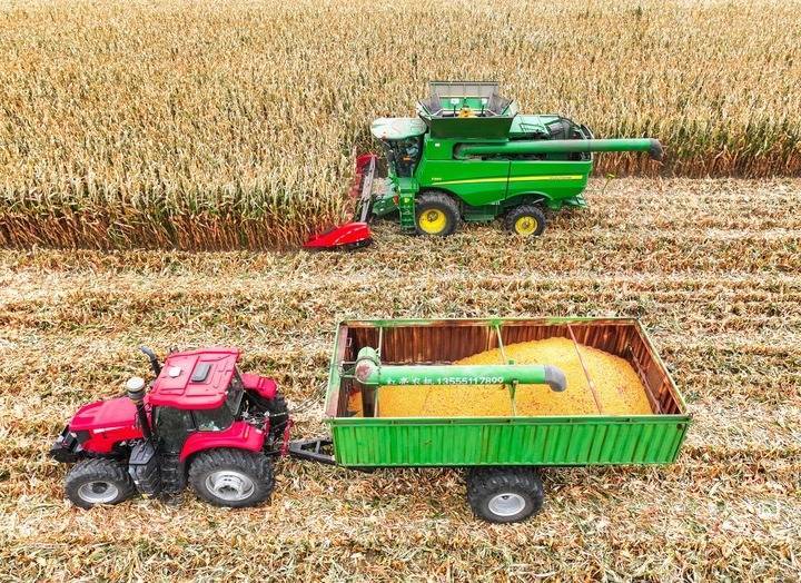 10月15日,在通辽市科尔沁区敖力布皋镇,农机手驾驶收割机收割玉米。通辽市还采取创新服务模式、培育多元服务主体、完善利益联结机制等举措,积极探索农业社会化服务。113个苏木镇场1809个嘎查村集体主动整合土地破解“地块散”难题,416家服务组织联动8家农事服务中心,推行统一采购农资、耕种作业、水肥管理、病虫害防治、机械收获、粮食销售的“六统一”服务,彻底打破小农户“单打独斗”的局限,推动传统种植向标准化、集约化、产业化转型。